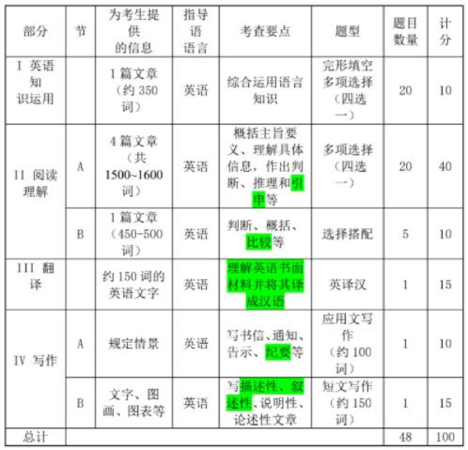 試題分四部分,包括英語知識運用、閱讀理解、翻譯和寫作,共 48 小題。