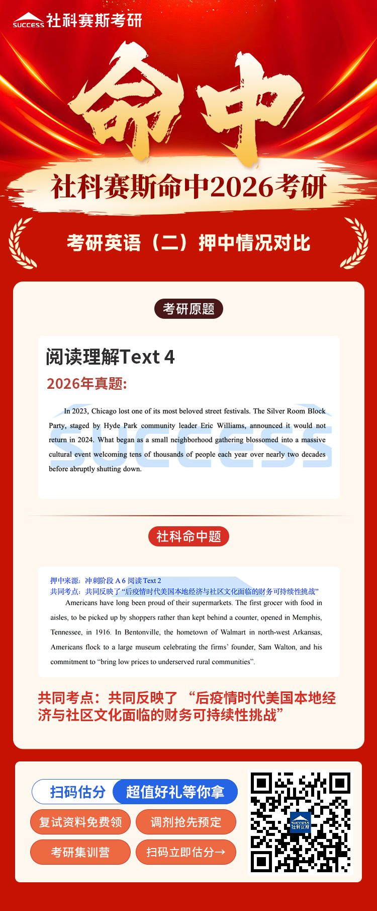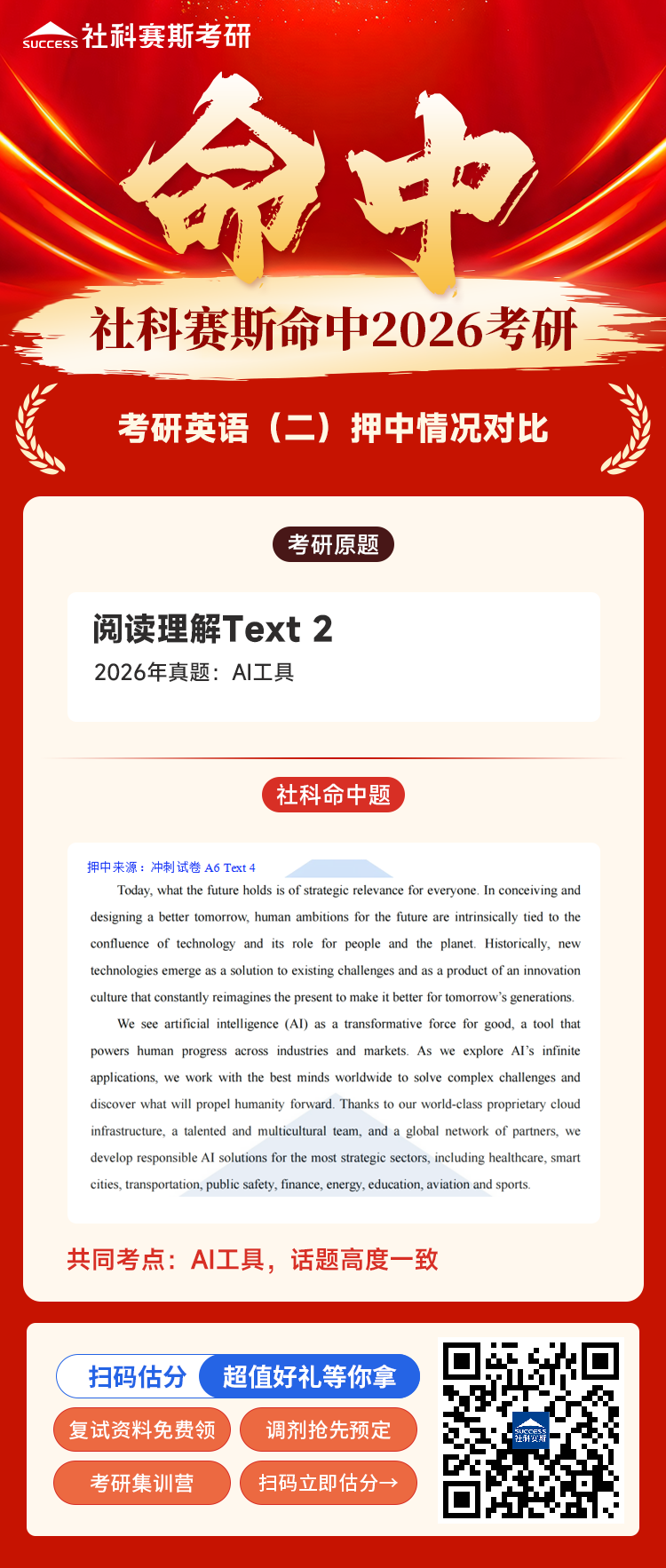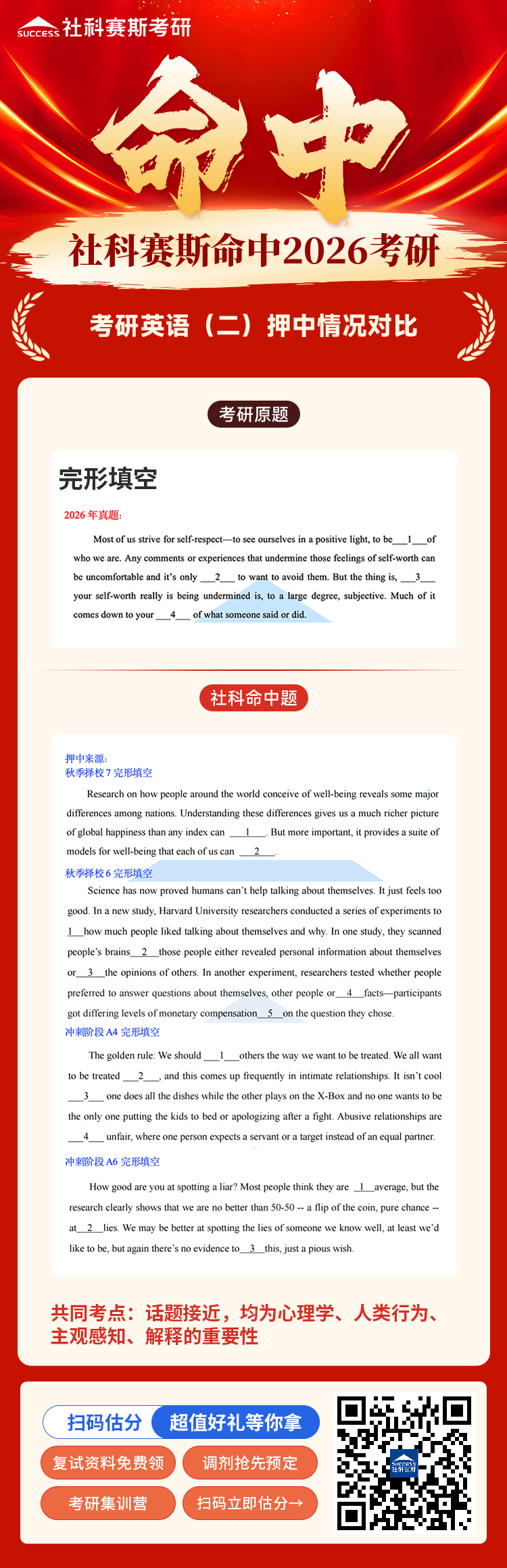 喜報(bào):社科賽斯考研再次命中2026考研(英語二)完型與閱讀理解真題!