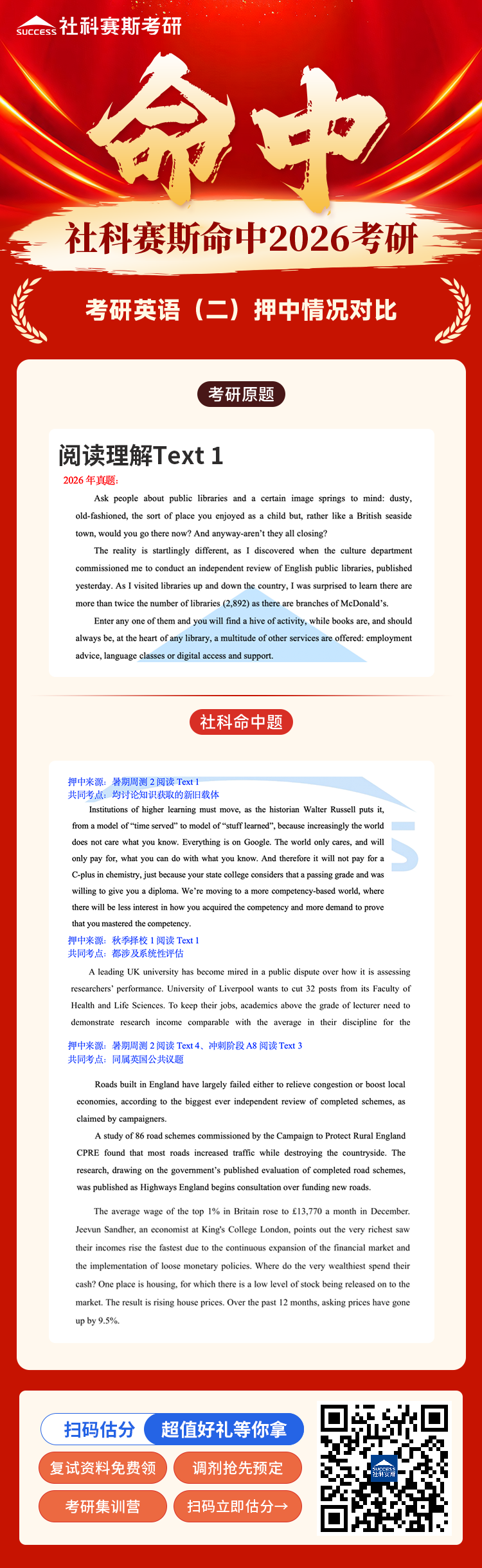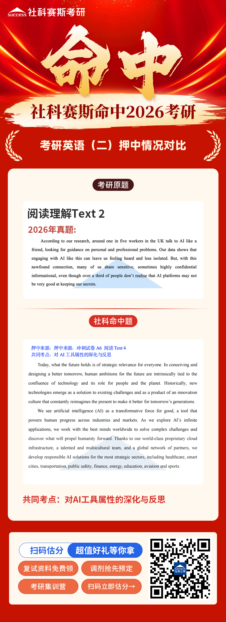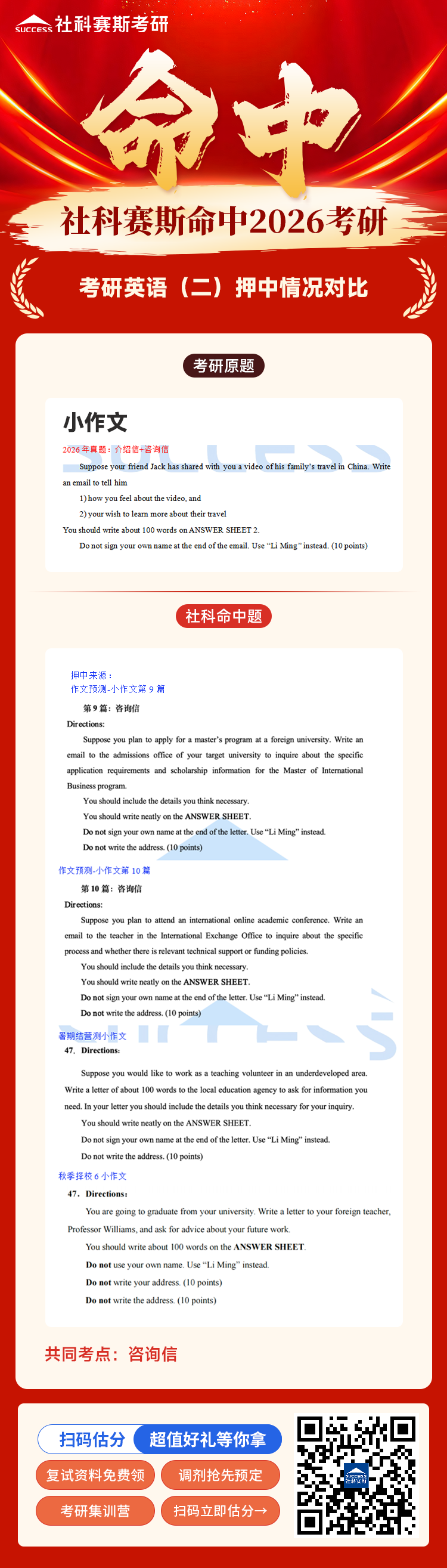 喜報(bào):社科賽斯考研再次命中2026考研(英語二)大小作文!